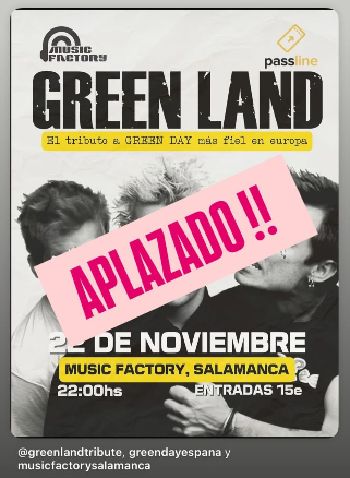 Lamentamos informar que el concierto de Green Land – Tributo a Green Day, previsto para el 22 de noviembre en Music Factory Salamanca, ha sido aplazado.