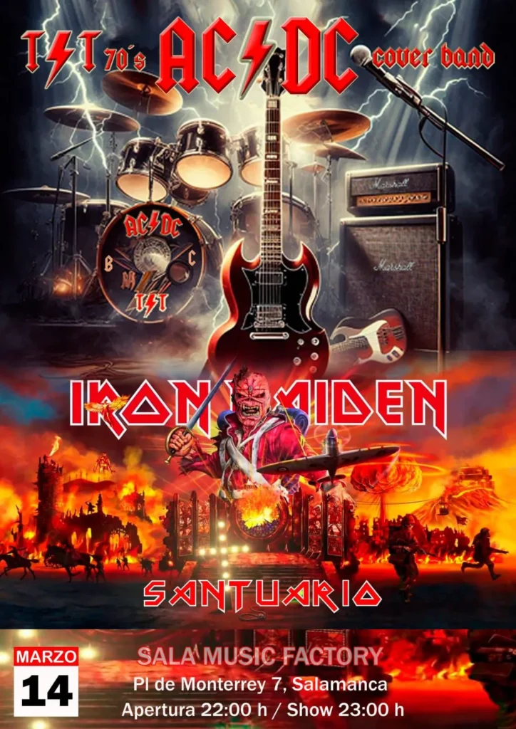 SANTUARIO traerá toda la épica y potencia del legado de Iron Maiden, mientras que T&T hará vibrar la sala con los clásicos más eléctricos de AC/DC en su etapa más legendaria.